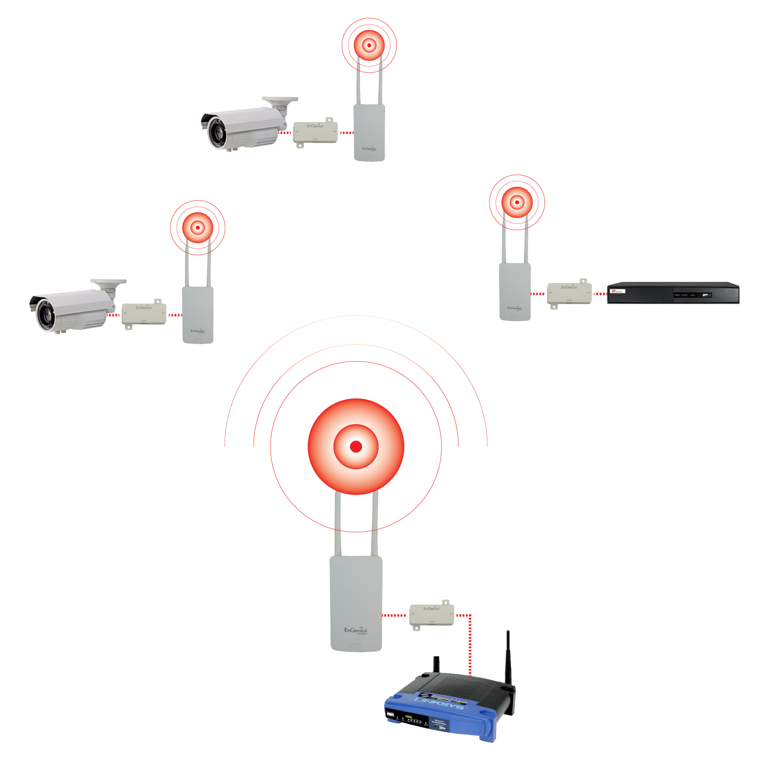 ENS202EXT to idealne rozwiązanie do bezprzewodowego łączenia kamer IP i rejestratorów pracujących w paśmie 2,4 GHz. Podwójna dookólna antena zewnętrzna 5 dBi, technologia MIMO (2 transmisory/2 receptory) i maksymalna transmisja mocy 26 dBm (konfigurowalna) pozwalają na podłączenie kamer na odległość kilku kilometrów (maksymalna odległość zależy od konkretnego środowiska). Antena o zysku 5 dBi posiada dookólny wykres promieniowania, który umożliwia podłączenie urządzeń w środowisku 360º.