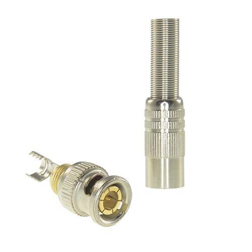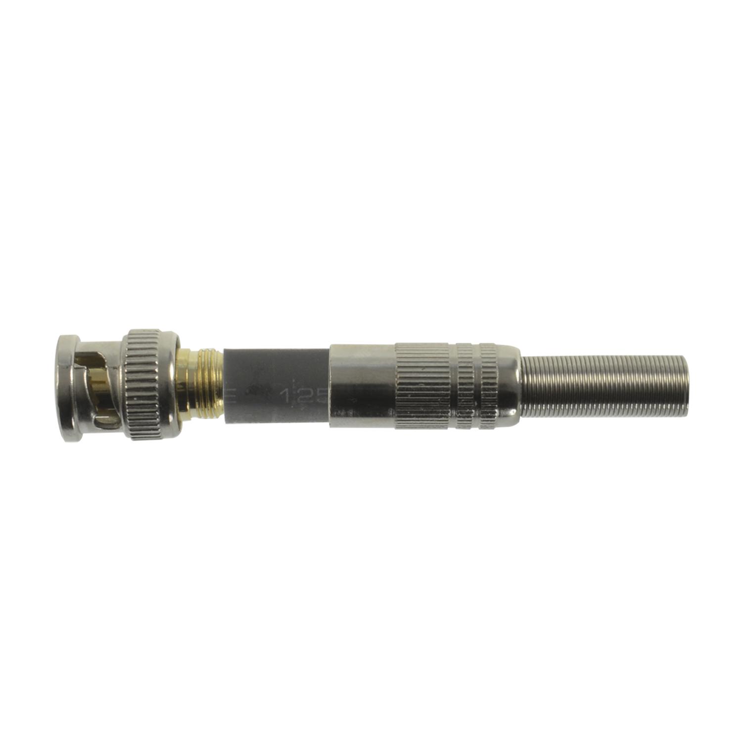 Centralna żyła kabla jest przylutowana bezpośrednio do złącza, a siatka jest mocowana przez ściśnięcie części w tym celu, aby połączenie było optymalne, zapewniając ciągłość. Zawiera tulejkę termokurczliwą dla mocniejszego mocowania. Złote obszary połączeń zapewniają odporność na korozję. Rozmiar połączenia kabla dostosowany do RG59.