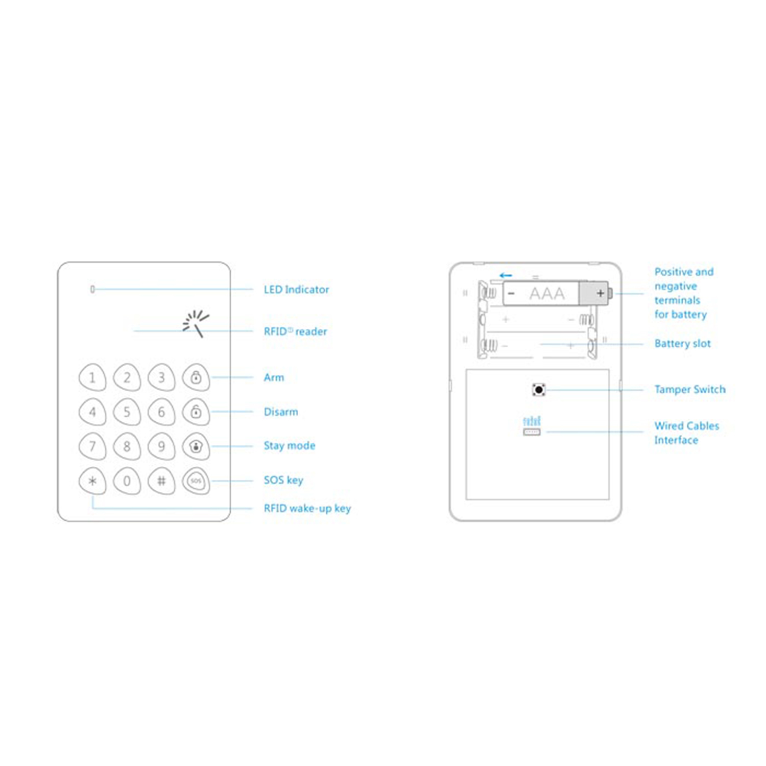 Niezależna klawiatura do uzbrajania/rozbrajania systemu alarmowego. Jest kompatybilny z panelem alarmowym, z którym komunikuje się bezprzewodowo i umożliwia uzbrajanie i rozbrajanie alarmu za pomocą klawiatury numerycznej lub pilotów zbliżeniowych.
