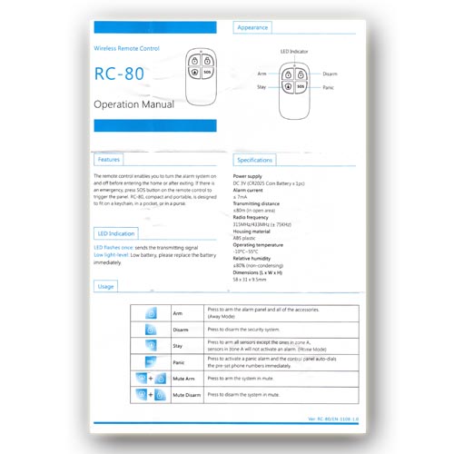 Pakiet zawiera 2 piloty, które umożliwiają różne operacje w maksymalnej odległości 80 metrów. Oprócz uzbrajania i rozbrajania alarmu dostępne są 4 dodatkowe przyciski do zaawansowanych funkcji.